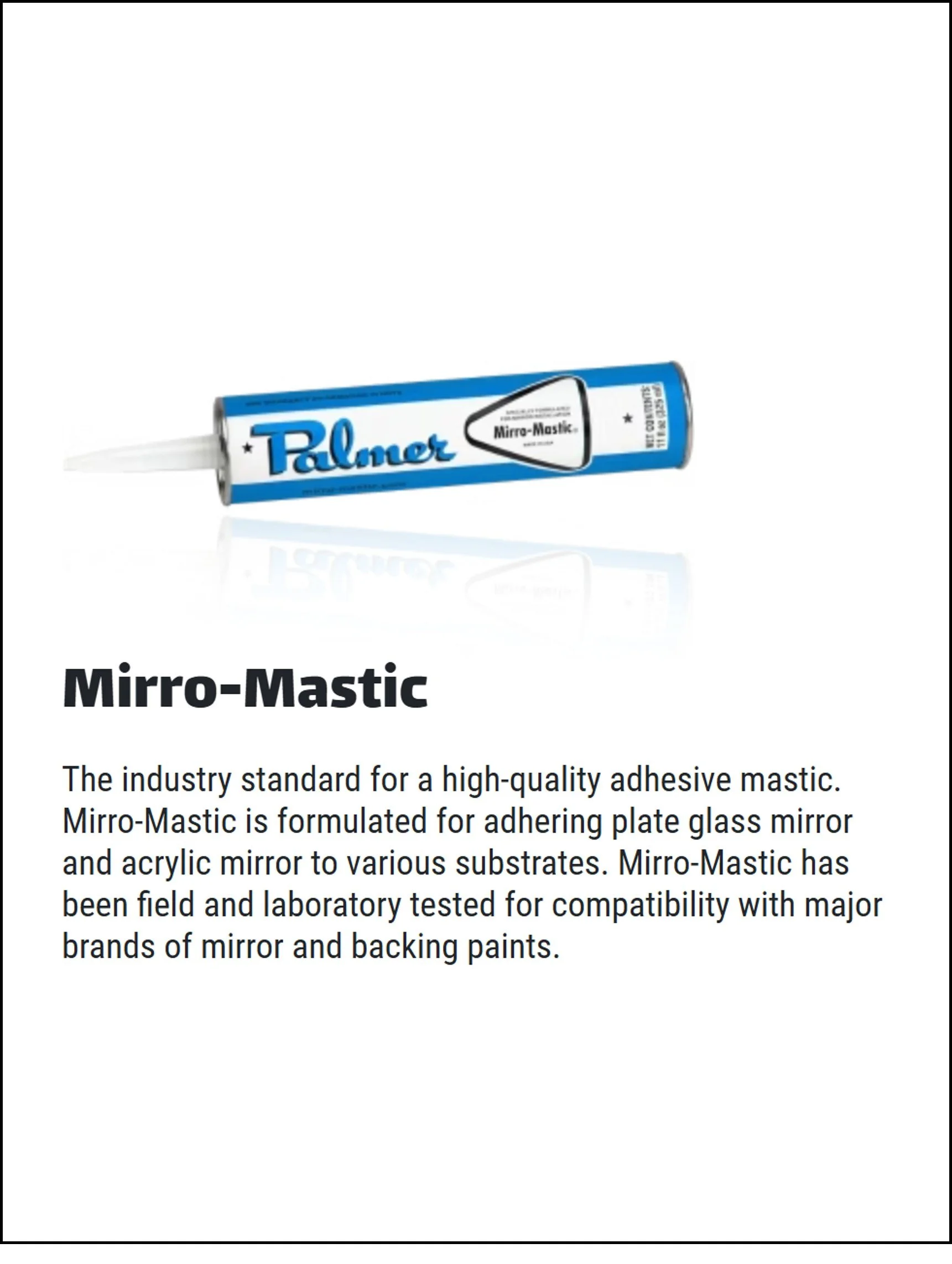 From high-quality adhesive mastics, to fast-curing mastics, to low-VOC solvent-free mastics in a variety of sizes and volumes and at competitive pricing, Palmer provides the perfect complement to you next mirror installation.